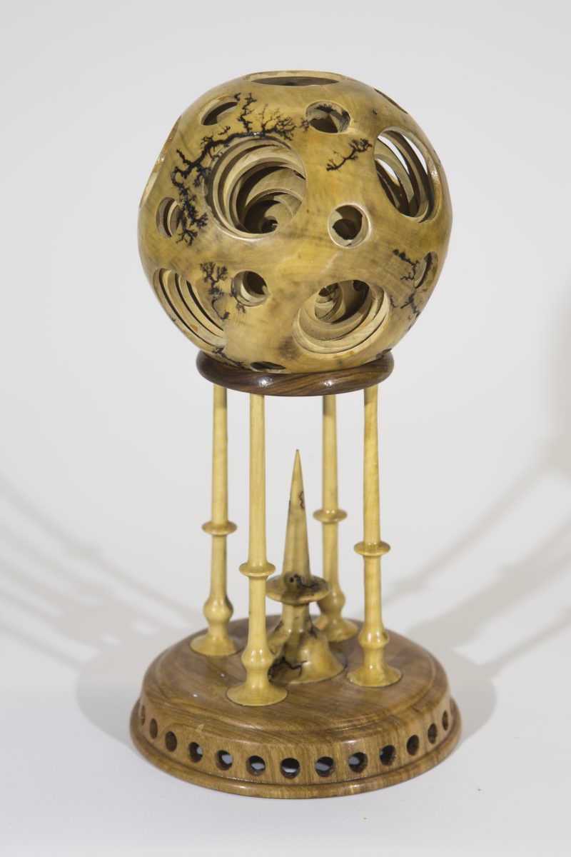 Buis, 12 sphères imbriquées, 102 mm de diamètre, socle en noyer et buis, hauteur totale 300 mm
