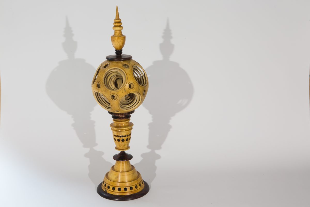 Boule de Canton en buis 63 mm de diamètre, 6 sphères imbriquées, sphère extérieure pyrogravée, sur pied en érable et ébène, hauteur 155 mm