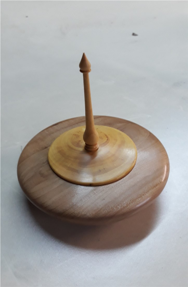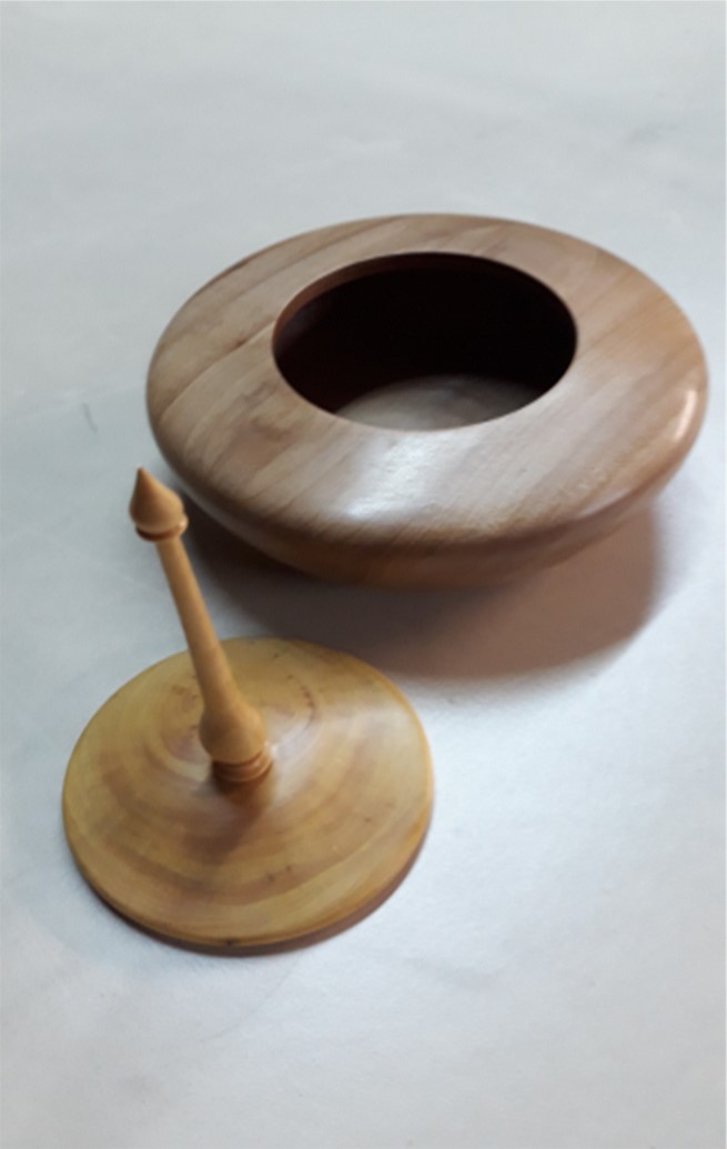 Boite en poirier, couvercle et fleuron en buis, diamètre 120 mm, hauteur 140 mm