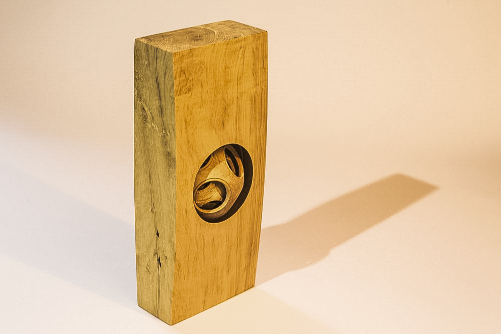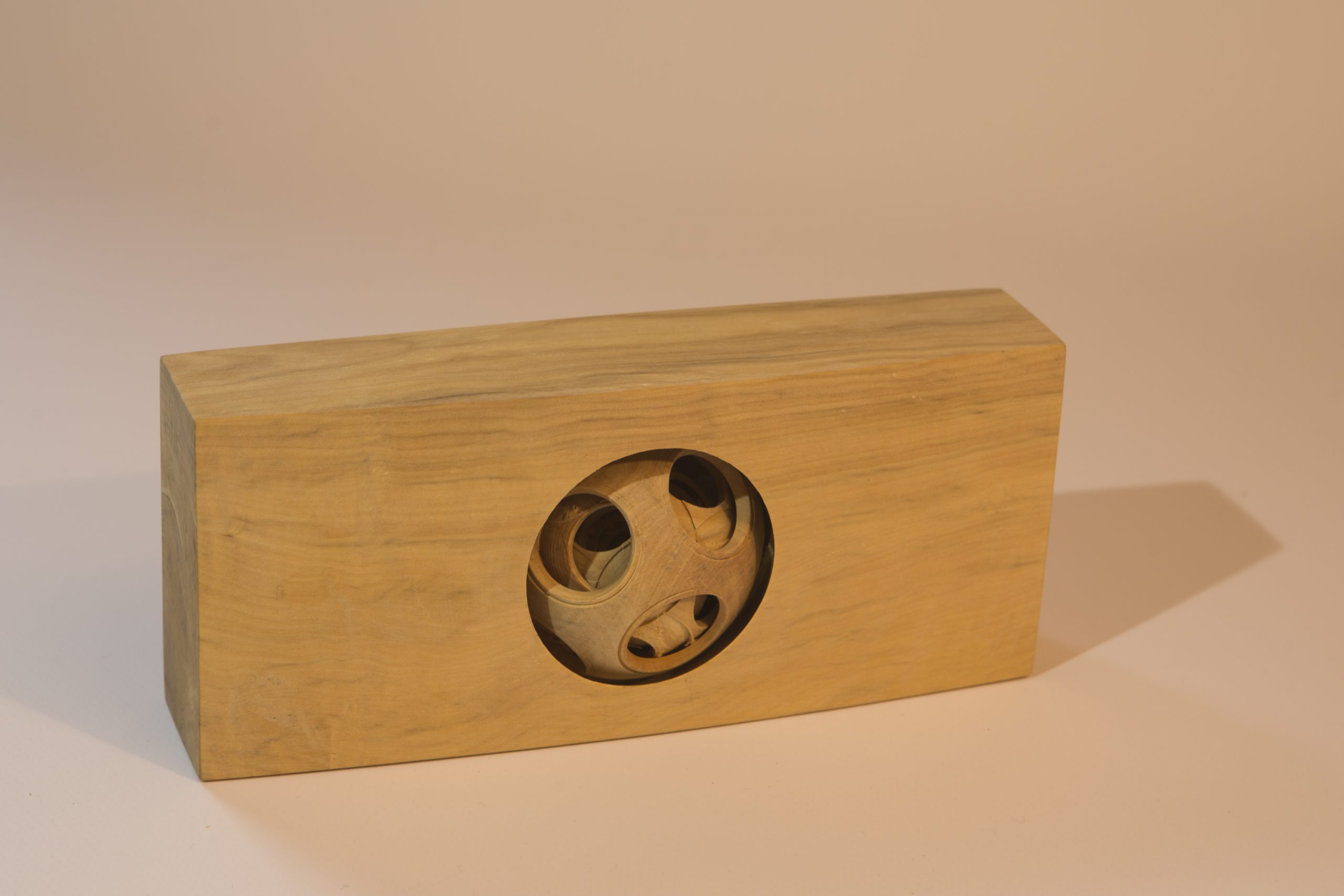 Boule de Canton de 65 mm de diamètre à 7 sphères imbriquées, prisonnière dans un bloc de buis, hauteur 200 mm, largeur 90 mm