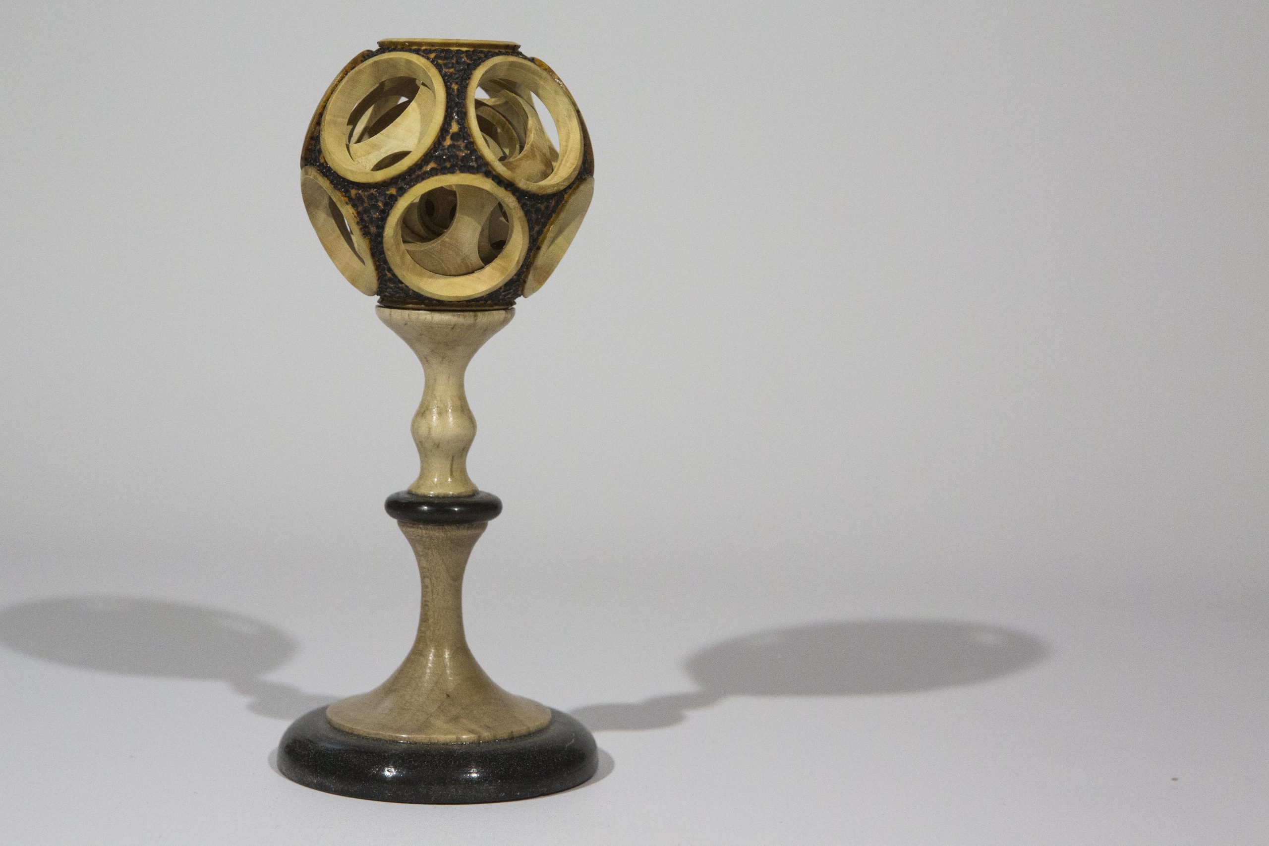 Boule de Canton en buis de 63 mm de diamètre, 6 sphères imbriquées, sphère extérieure pyrogravée, sur pied en érable et ébène, hauteur totale 155 mm